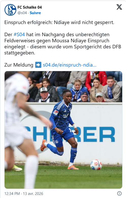 Le Schalke 04 a obtenu gain de cause dans un dossier disciplinaire qui pouvait peser sur sa fin de saison. La commission de discipline de la Fédération allemande de football a décidé d’annuler le second carton jaune infligé à Moussa Ndiaye lors de la rencontre face à SV Elversberg.