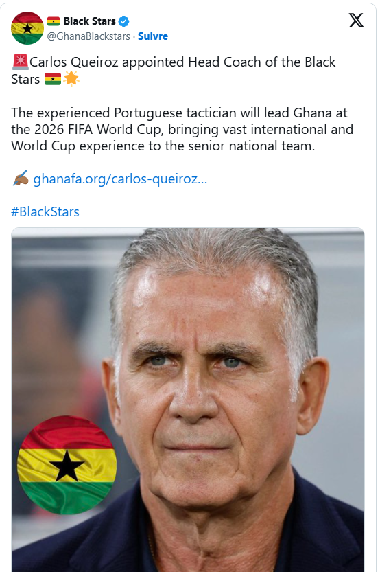 À l’approche de la Coupe du monde, le Ghana opère un choix fort pour relancer sa sélection. Les Black Stars ont officialisé la nomination de Carlos Queiroz comme nouveau sélectionneur, à moins de deux mois du coup d’envoi du tournoi prévu en Amérique.