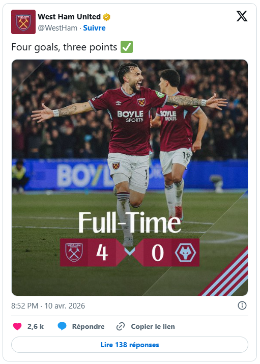 Portés par une prestation aboutie, les coéquipiers d’El Hadji Malick Diouf ont dominé la lanterne rouge dans leur antre du London Stadium, signant un succès aussi précieux que convaincant dans la course au maintien. Cette victoire permet aux Hammers de sortir provisoirement de la zone de relégation. Désormais 17es avec 32 points, ils passent devant Tottenham, relégué à la 18e place avec 30 unités.